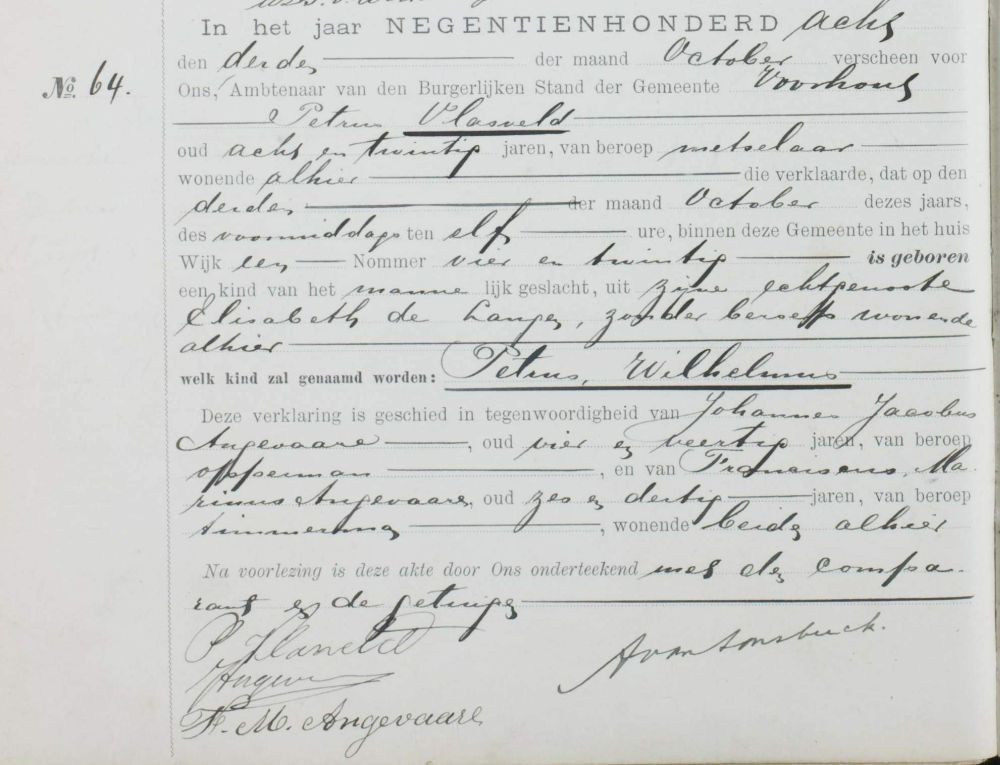 Geboorte Akte Petrus Wilhelmus Vlasveld, 1908 Voorhout - archief Leiden, akte 64