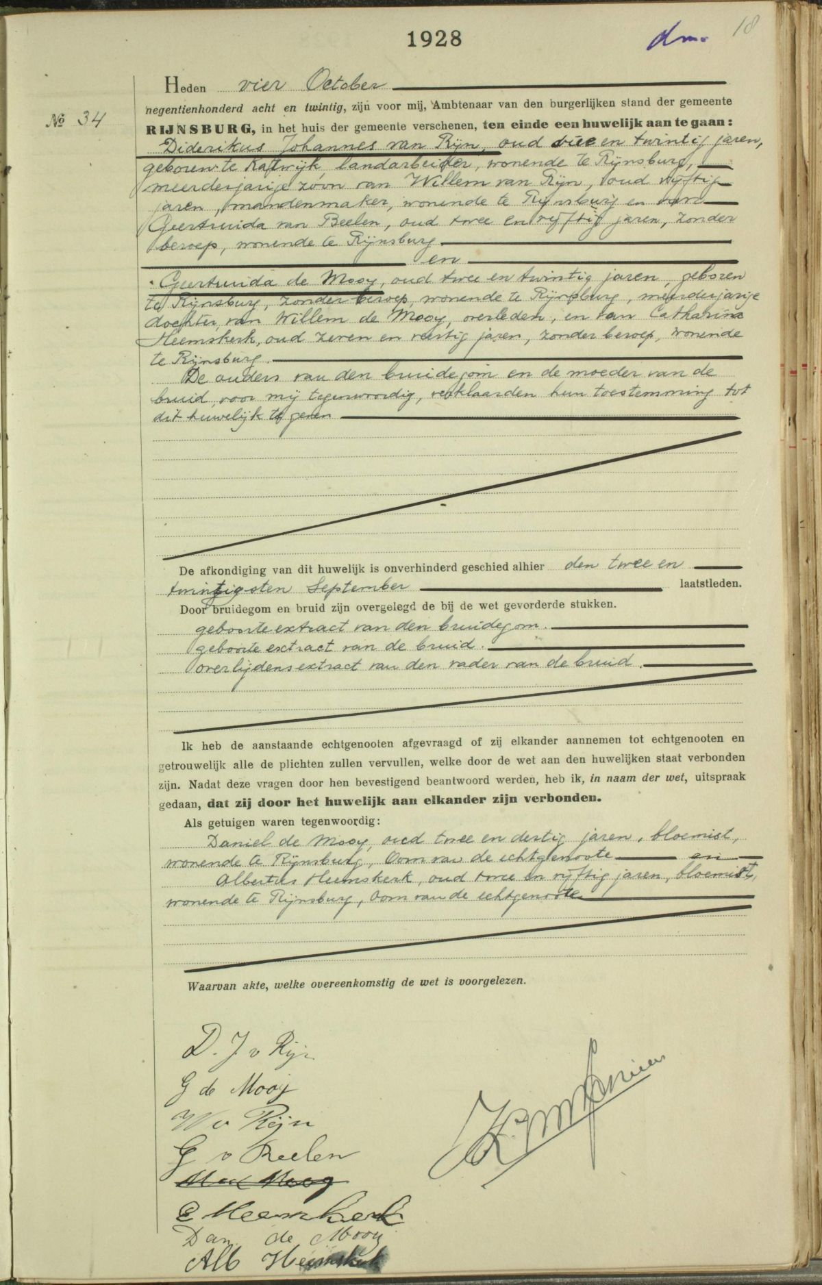 Huwelijks Register Rijnsburg 1928 - archief Leiden, folio 18 - akte 34